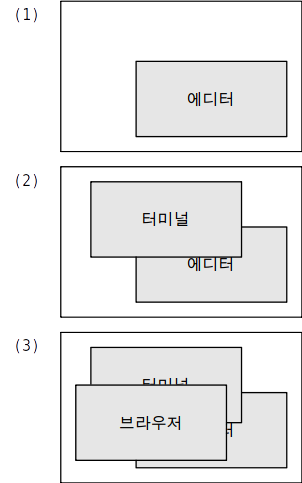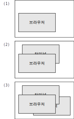 우선 떠오르는 방법은 가장 아래에 깔린 뷰부터 그리는 것이다. 이렇게 하면 우선 메모장을 그리고, 다음에 터미널, 마지막으로 브라우저를 그리면 된다. 이를 그림으로 표현하면 아래와 같다.
