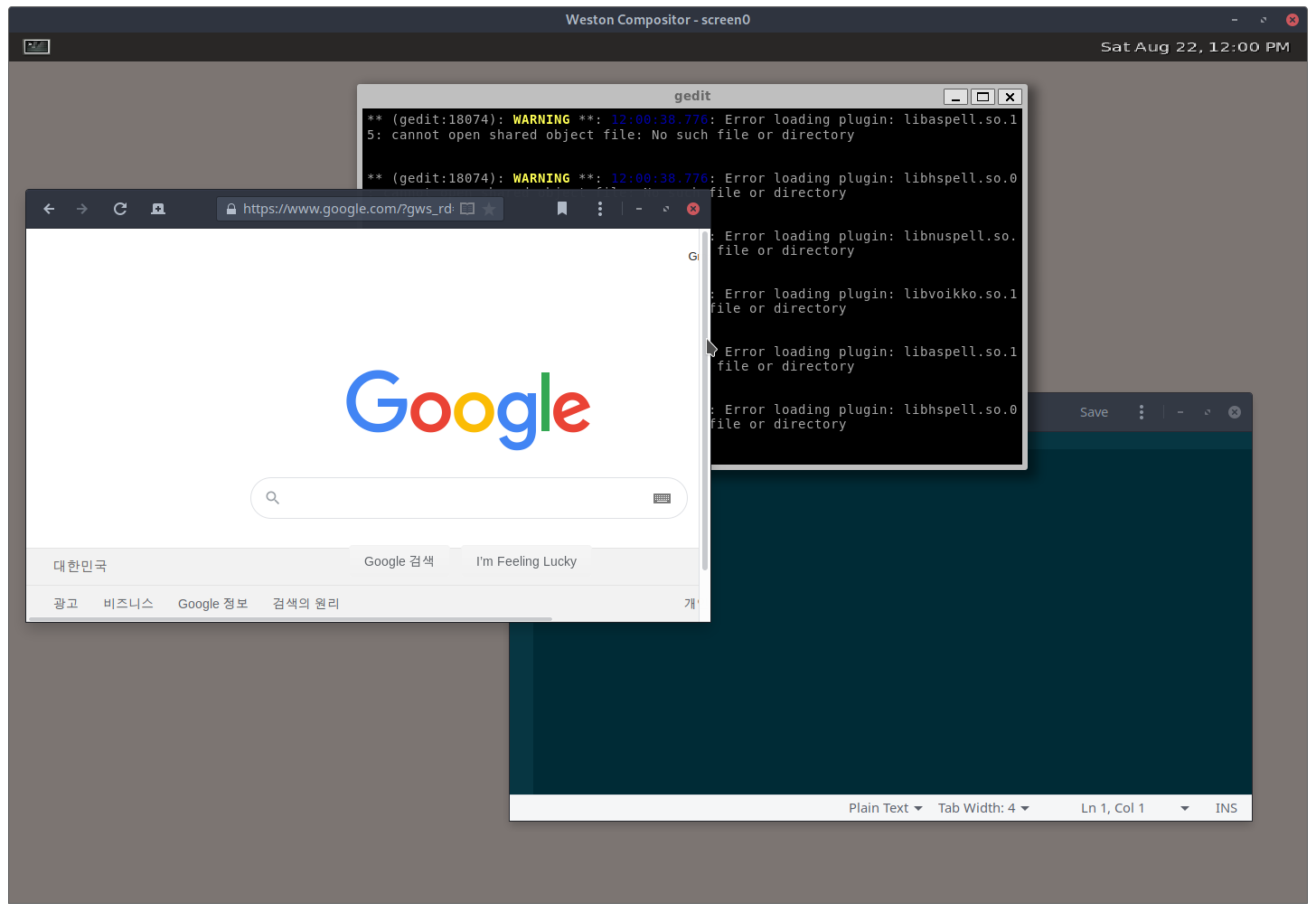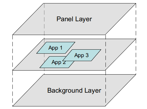 위에 있는 weston 화면을 보자. 맨 위에는 시간정보를 제공하는 패널이 보이고, 아래에 세 앱이 실행되고 있다. 그리고 화면 가장 뒤에는 회색의 배경화면이 있다. weston은 각각의 영역을 레이어로 구분하여, 순서대로 쌓는다. 따라서 어플리케이션은 항상 백그라운드를 덮어쓰고, 패널은 항상 어플리케이션을 덮어쓴다. (weston desktop-shell에서는 어플리케이션이 패널 영역으로 이동할 수 없도록 되어 있다.)