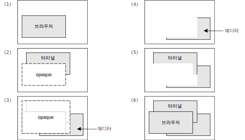 가장 앞에 있는 뷰부터 그리는 방법은 직관적이지 않고, 관리하는데 약간 복잡하다. 먼저 브라우저의 뷰를 그린다음, 브라우저가 차지한 영역을 opaque(투명한) 영역이라고 지정한다. 다음 터미널을 그릴때는 opaque 영역을 뺀 나머지 영역만 그린다. 그리고 opaque 영역에 터미널 영역을 추가한다.