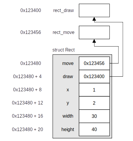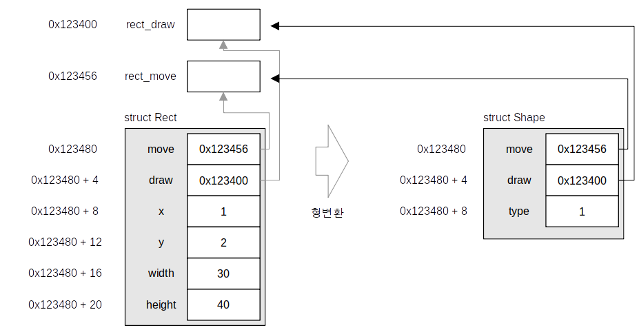 main 함수의 생김새가 Cpp class와 매우 유사해졌다. 구조체의 초기화 코드(new_rect)에서 struct Rect의 함수포인터 draw, move에 실제 함수를 할당했기 때문에, 이후에 함수포인터를 사용하는 것 만으로도 실제 함수를 호출하는 것과 동일한 기능을 할 수 있다.
