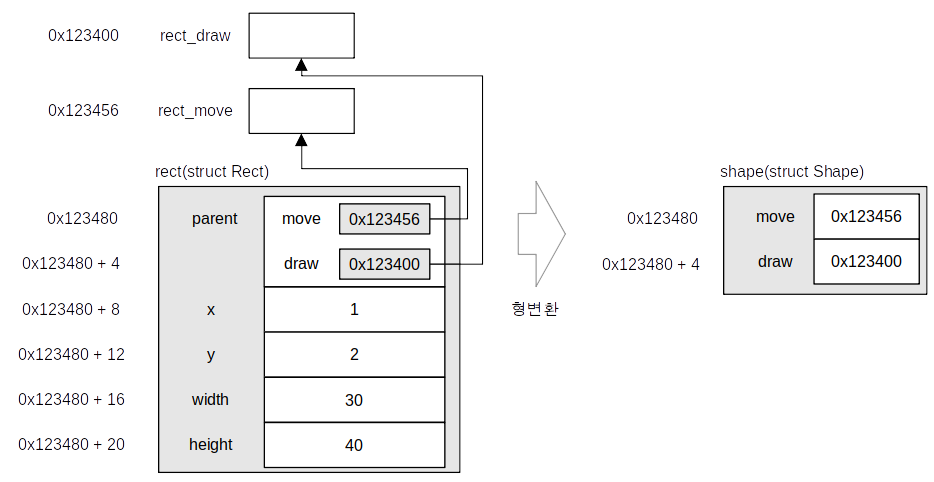 부모 구조체를 구조체의 첫 번째 변수로 선언하면, 아주 간단한 형 변환을 통해 사용할 수 있다. 이는 Rect 구조체의 인스턴스 (위의 예에서는 rect) 주소와 해당 인스턴스의 parent의 주소가 일치하기 때문이다. 위의 그림을 보면 좀 더 이해가 쉽다. rect를 shape로 형변환하더라도 구조체의 시작 주소는 0x123480으로 동일하다. 또한 rect와 shape의 멤버들은 주소가 겹치지 않기 때문에 사용하는데 있어 메모리 주소 충돌 등의 문제가 생길 일도 없다.