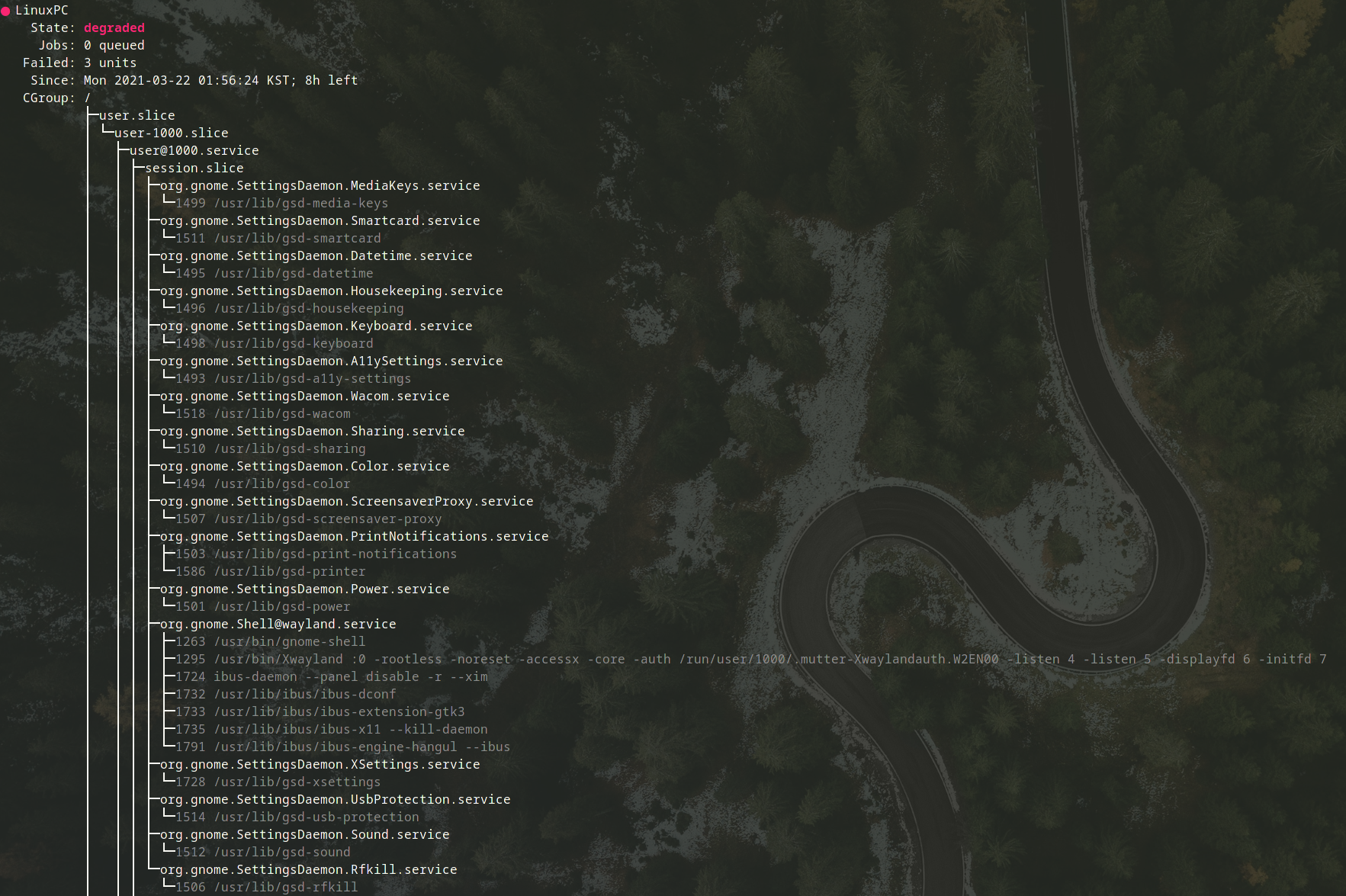 Systemd는 systemctl이라는 유틸을 통해서 서비스의 상태를 모니터링 및 관리 한다. 우선 시스템의 상태를 모니터링 하는 명령어는 다음과 같다.