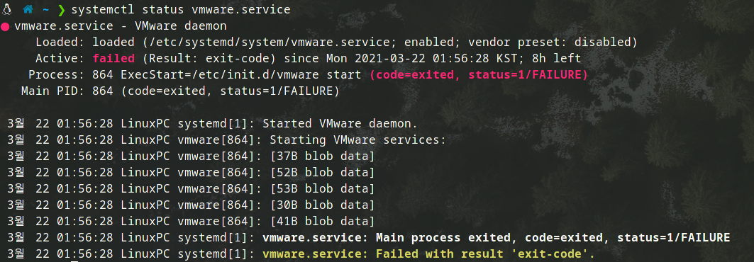 vmware 서비스가 왜 정상동작을 하지 않는지를 확인하기 위해서 systemctl status vmware.service를 입력하였다. 그러면 아래와 같이 서비스의 상태와 서비스가 출력한 로그 정보 등이 나온다. 아쉽게도 여기서는 별다른 힌트가 될 만한 에러 메시지가 보이지는 않지만, 이와 같은 방식으로 문제에 대한 힌트를 찾아볼 수 있다.