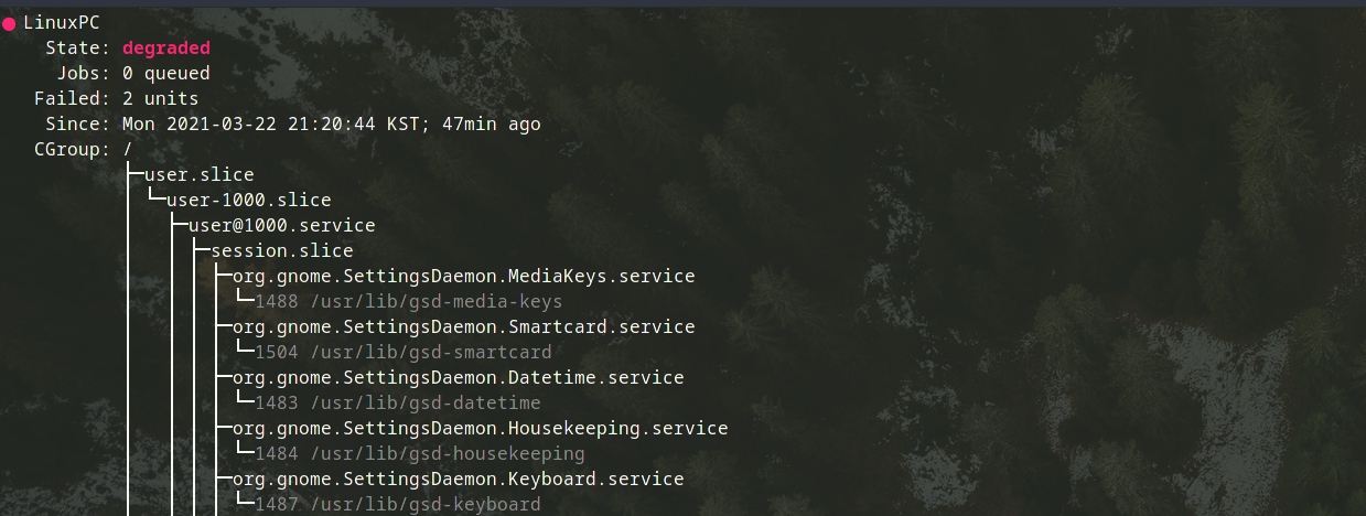세 가지 명령어가 굉장히 유사해 보이는데, 자세히 보면 미묘하게 차이점들이 있다. 우선 systemctl status 명령어는 유닛들을 cgroup으로 묶어서 보여준다. (cgroup(control group)은 리눅스가 프로세스 그룹이 소모하는 자원을 컨트롤 하는 기능이다.) 이 명령어를 이용하면 systemd에서 유닛들이 어떤 cgroup으로 묶여서 실행되는지를 쉽게 파악할 수 있다. 또한 위에서 state: degraded에서 볼 수 있듯이 전체적으로 몇 개의 유닛이 오동작하는지도 확인할 수 있다. systemctl --failed 명령어를 통해서 오동작 하는 유닛에 대해 자세히 볼 수 있다.