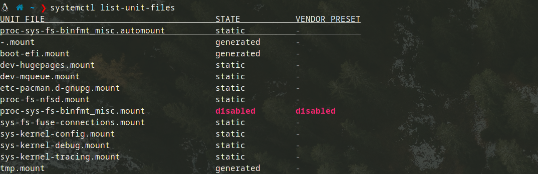 마지막으로 systemctl list-unit-files는 설치된 파일들을 출력한다. 즉 로딩되지 않았더라도 유닛 파일(.service, .mount, .device 등)로 있는 모든 서비스를 출력한다.