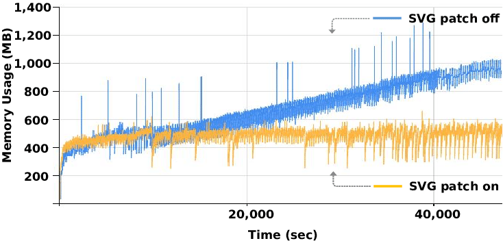 메모리 릭은 프로그램이 불필요한 메모리를 계속 점유하는 현상이다. 일반적으로 프로그램 가동 시간 혹은 사용량에 비례해서 프로그램의 메모리 사용량이 점점 늘어나는 것으로 확인할 수 있다. 아래 그림의 파란색 그래프(SVG patch off)가 메모리 릭이 발생한 모습이다. 사용 시간에 따라서 점진적으로 메모리 사용량이 증가하는 모습을 관찰할 수 있다. 반면 메모리 릭이 발생하지 않은노란색 그래프(SVG patch on)는 오르락 내리락 하면서 일정한 메모리 사용량을 보인다.