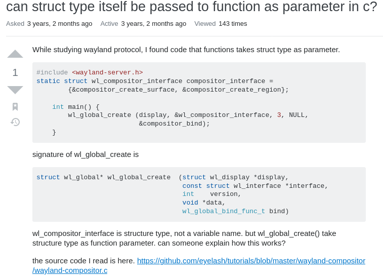 | Note if (!wl_global_create(ec->wl_display, &wl_compositor_interface, 4, ec, compositor_bind)) goto fail; 위 코드에서 "wl_compositor_interface" 때문에 한동안 코드 독해에 고생하였다. 왜냐하면 libweston/compositor.c에 다음 선언이 있기 때문이다. static const struct wl_compositor_interface compositor_interface = { compositor_create_surface, compositor_create_region }; 마치 struct의 이름을 '&' 참조를 통해 함수에 인자로 전달한 것 처럼 보이기 때문이다. C 언어에 익숙하다면, 해당 문법이 성립되지 않음을 알 수 있다. 위 구문이 당황스러웠던 것은 나 뿐만이 아니었던 것 같다. Stackoverflow에 보면 비슷한 질문이 올라와 있다. ![]() (출처: stackoverflow.com/questions/44101813/can-struct-type-itself-be-passed-to-function-as-parameter-in-c) 어떻게 된 일일까?사실 wl_compositor_interface은 wayland_protocol.h 헤더에서 struct wl_interface 형으로 선언되어 있다. 즉 wl_global_create에 전달된 wl_compositor_interface는 어떤 구조체의 이름이 아니라, 단순히 wayland_protocol.h에 정의된 struct wl_interface형 변수였던 것이다 ![]() |