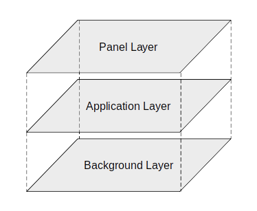 위에 있는 weston 화면을 보자. 맨 위에는 시간정보를 제공하는 패널이 보이고, 아래에 세 앱이 실행되고 있다. 그리고 화면 가장 뒤에는 회색의 배경화면이 있다. weston은 각각의 영역을 레이어로 구분하여, 순서대로 쌓는다. 따라서 어플리케이션은 항상 백그라운드를 덮어쓰고, 패널은 항상 어플리케이션을 덮어쓴다. (weston desktop-shell에서는 어플리케이션이 패널 영역으로 이동할 수 없도록 되어 있다.)